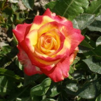 Кусты вырастают мощными и крепкими. Длина побегов в среднем равна 80 см, а ширина кроны – 60 – 80 см. Листья насыщенно-изумрудного цвета, с глянцевой поверхностью. Саженцы обходятся без опоры. На макушках стеблей формируются роскошные бокаловидные бутоны, диаметром 10 – 14 см. Лепестки аккуратно уложены по спирали. У основания они желтые, а далее постепенно приобретают розовые тона. Ближе к краям они становятся ярко-красными. Период цветения длится от 7 до 15 дней. Роза источает приятный и ненавязчивый аромат.
